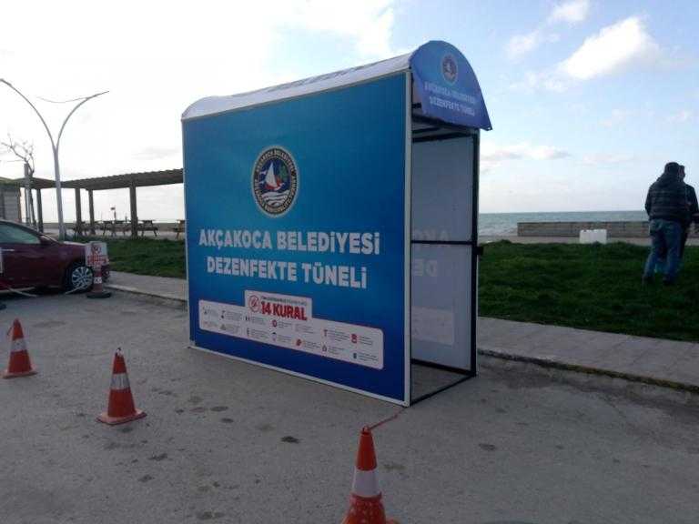 Akçakoca Belediyesi, korona virüs tedbirleri kapsamında kendi atölyesinde ürettiği dezenfeksiyon tünelini vatandaşların hizmetine sundu.