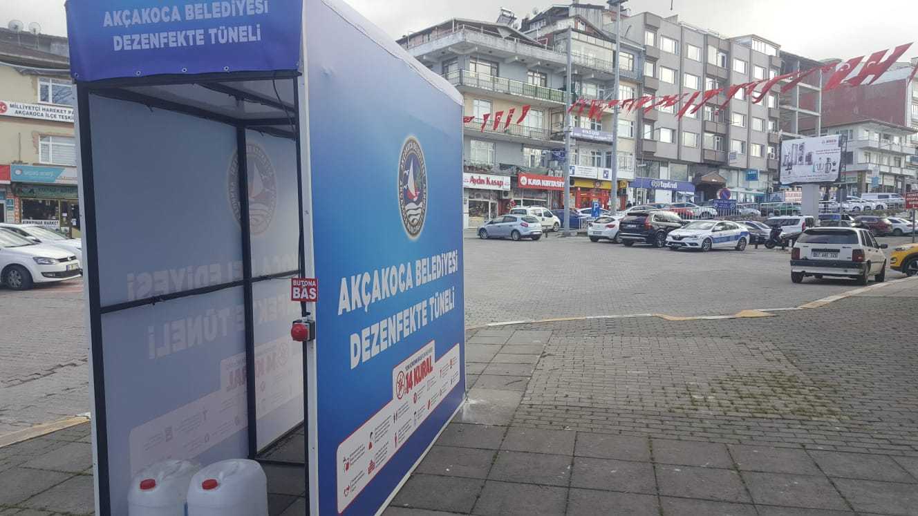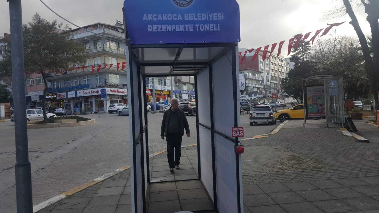 Akçakoca Belediyesinin ekipleri, korona virüs salgını ile mücadele kapsamında dışarı çıkmak zorunda kalan vatandaşlar için şehrin belirli noktalarına dezenfeksiyon tüneli yerleştirdi.
