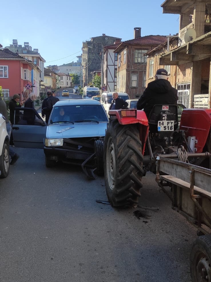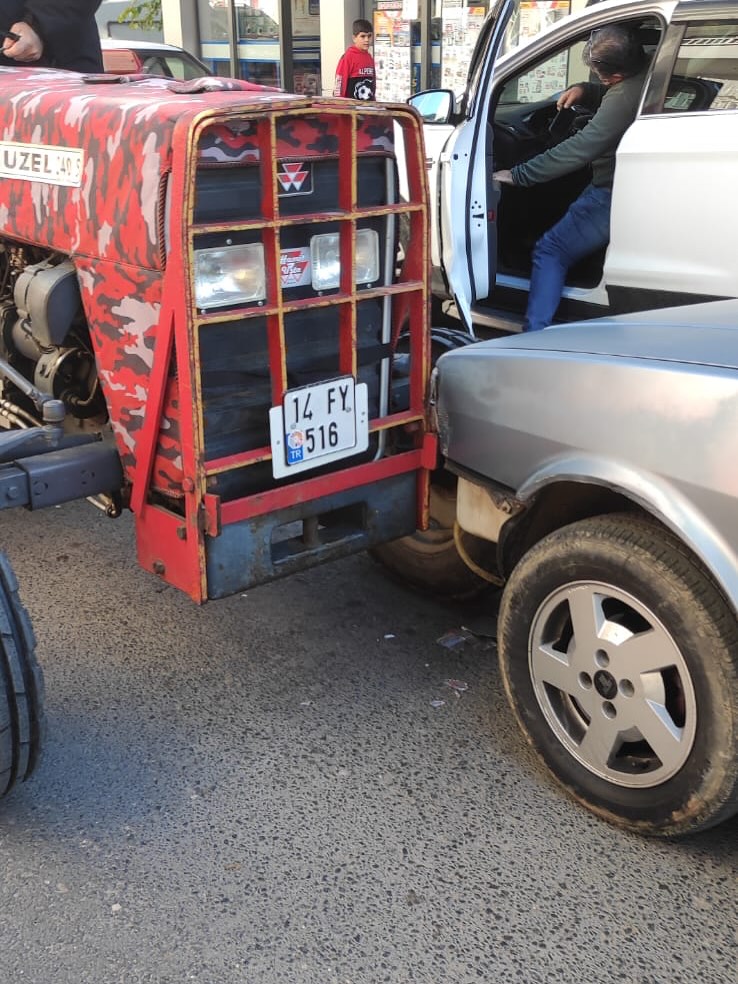 Akçakoca Beşyol mevkiinde bir zincir marketin önünde sabah saatlerinde ilginç bir kaza yaşandı. Saat 10:30 sularında 14 FY 516 plakalı traktör, dar yolda fren yaptı ancak debriyaja basmayı unutan yaşlı sürücü, öndeki otomobile çarptı.