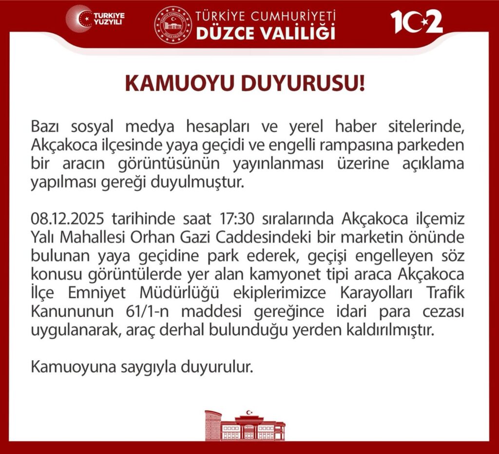 Kamuoyunda oluşan farkındalık sonrası Düzce Valiliği, konuyla ilgili resmi bir açıklama yaptı. Açıklamada, 08 Aralık 2025 tarihinde saat 17.30 sularında Akçakoca Yalı Mahallesi Orhangazi Caddesi’nde bir market önünde yaya geçidine park eden kamyonet tipi aracın, Akçakoca İlçe Emniyet Müdürlüğü ekiplerince tespit edildiği, Karayolları Trafik Kanunu 61/1-n maddesi gereği idari para cezası uygulandığı ve aracın derhal bulunduğu yerden kaldırıldığı belirtildi.