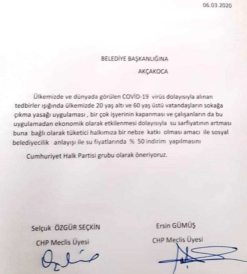 ”Ülkemiz ve dünyada görülen Covid- 19 virüs dolayısıyla alınan tedbirler ışığında, ülkemizde 20 yaş altı ve 60 yaş üstü vatandaşlara sokağa çıkma yasağı uygulanması, birçok işyerinin kapanması ve çalışanların da bu uygulamadan ekonomik olarak etkilenmesi dolayısıyla, su sarfiyatının artması, buna bağlı olarak tüketici halkımızabir nebze katkı olması amacı ile, sosyal belediyecilik anlayışı ile su fiyatlarında yüzde 50 indirim yapılmasını, Cumhuriyet Halk Partisi grubu olarak öneriyoruz.”