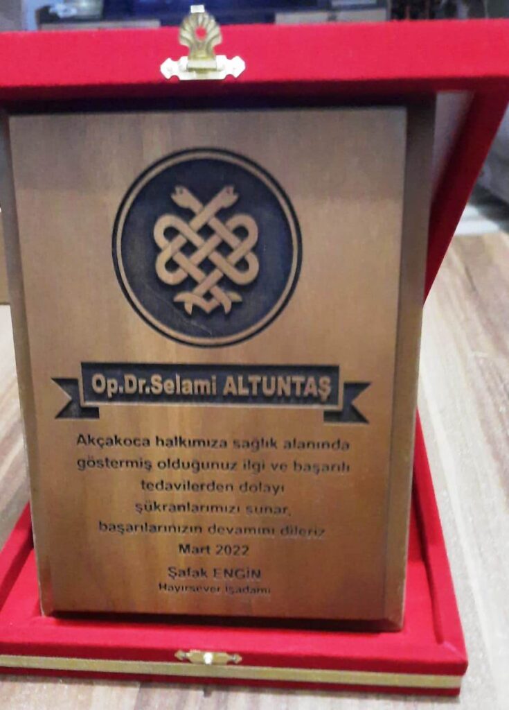 Akçakoca halkının gönlünde yer tutması nedeniyle Selami hocaya plaketini takdim eden yardım sever Şafak Engin, ”Selami Altuntaş hocamızın hekimliğinin yanı sıra insanlığı da bizleri etkiliyor. Böyle bir hekime yakın olsuğumuz için şanslıyız. İnşallah Selami hoca bu bölgeden başka yere gitmez. Hocamızın yaptıklarına karşı çam sakızı çoban armağanı bir plaketle kendisine teşekkür etmek istedik. Allah yolunu ve bahtını açık etsin” dedi.