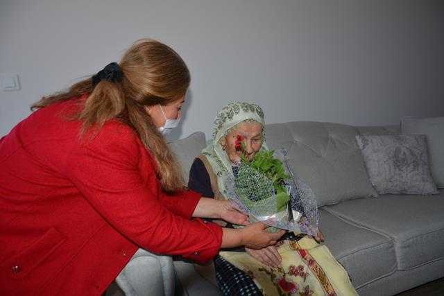 100 yaşında olan asırlık çınar Hatice Rabiye nineye de çiçeklerini Nursen Yanmaz takdim etti.